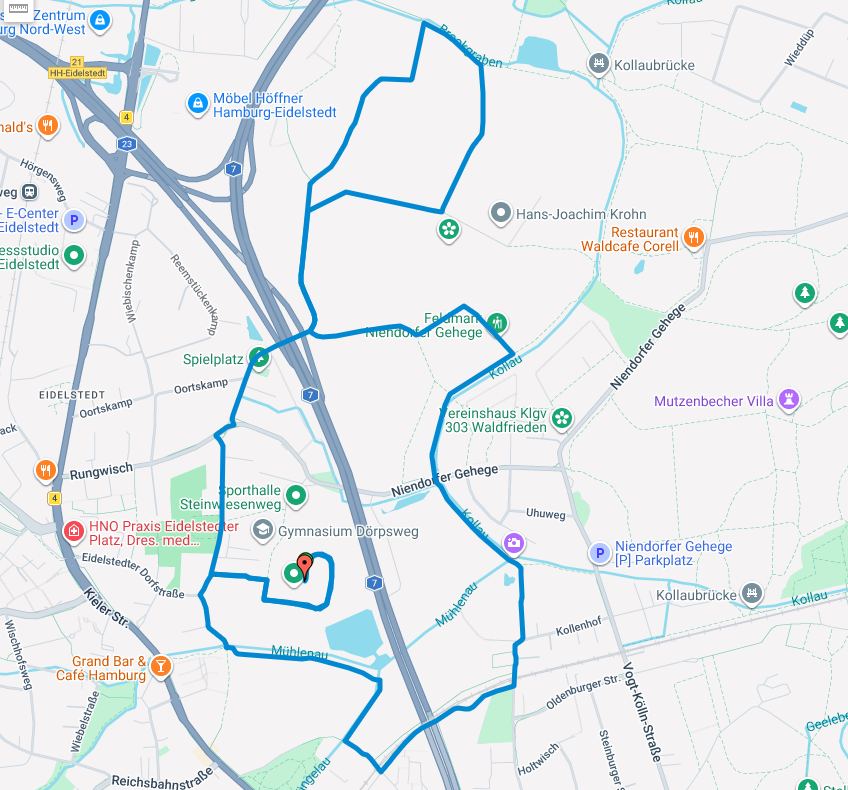 Streckenverlauf: Wurtkamp, Dörpsweg, Eidelstedter Feldmark, Schöpbachweg, Wegenkamp, Kollauwanderweg,  Amerkamp, Duvenacker, Holloswisch, Beentkamp, Duvenacker, Rungwisch, Dörpsweg, Wurtkamp – diese Strecke wird dreifach durchlaufen