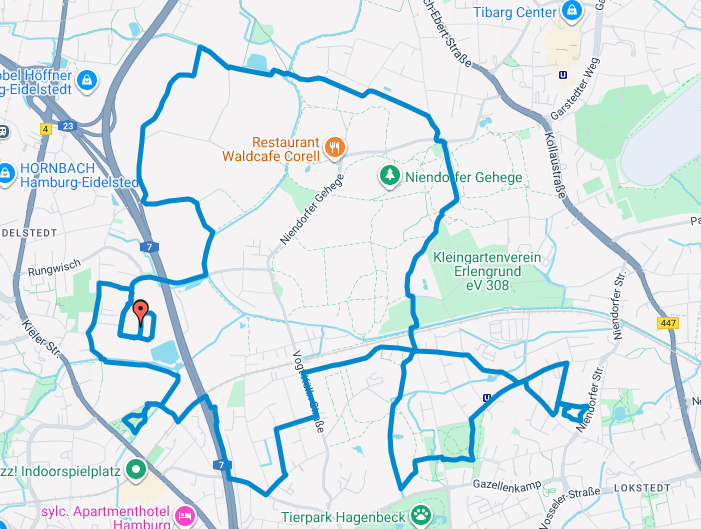 7,5 km: Start Stadion Steinwiesenweg – Steinwiesenweg, Niendorfer Gehege, Kollauwanderweg, Amerkamp, Duvenacker, Beentkamp, Brookgraben (Gehege), Bondenwald, Niendorfer Gehege, Kollauwanderweg, Niendorfer Gehege, Steinwiesenweg – Ziel Stadion Steinwiesenweg