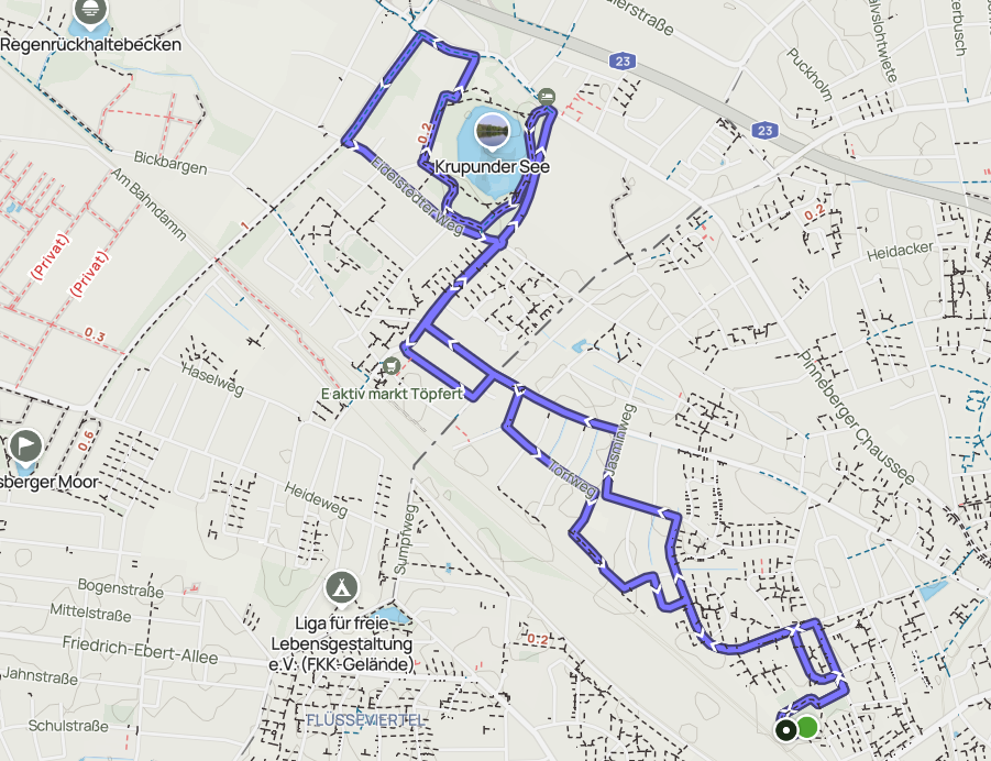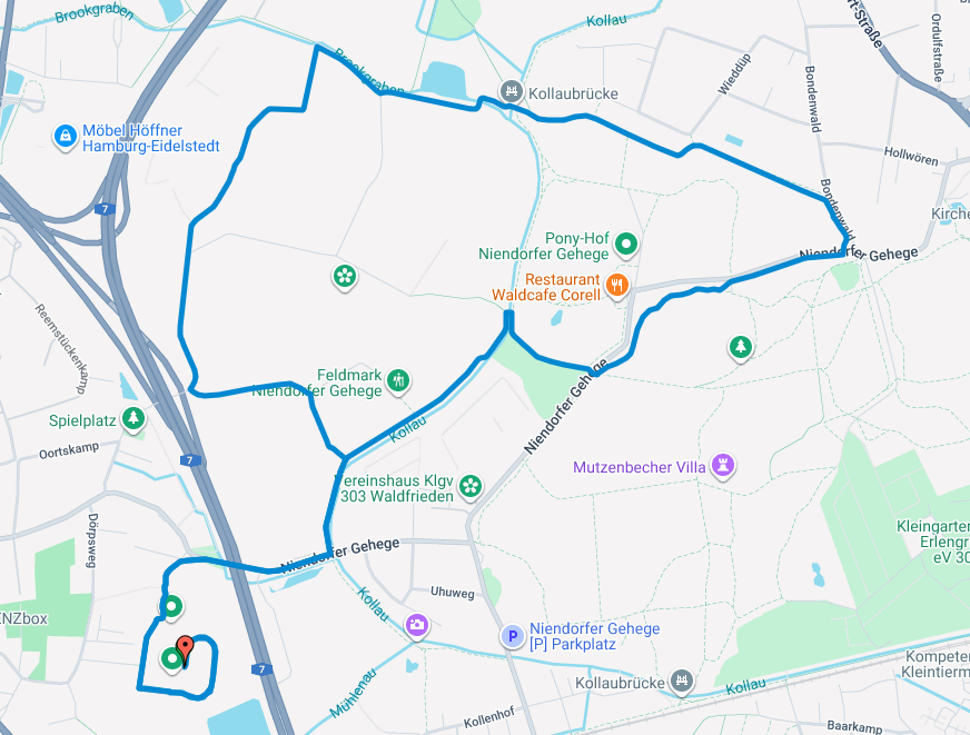 7,5 km: Start Stadion Steinwiesenweg – Steinwiesenweg, Niendorfer Gehege, Kollauwanderweg, Amerkamp, Duvenacker, Beentkamp, Brookgraben (Gehege), Bondenwald, Niendorfer Gehege, Kollauwanderweg, Niendorfer Gehege, Steinwiesenweg – Ziel Stadion Steinwiesenweg