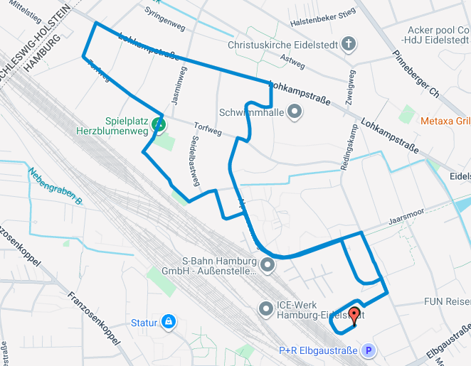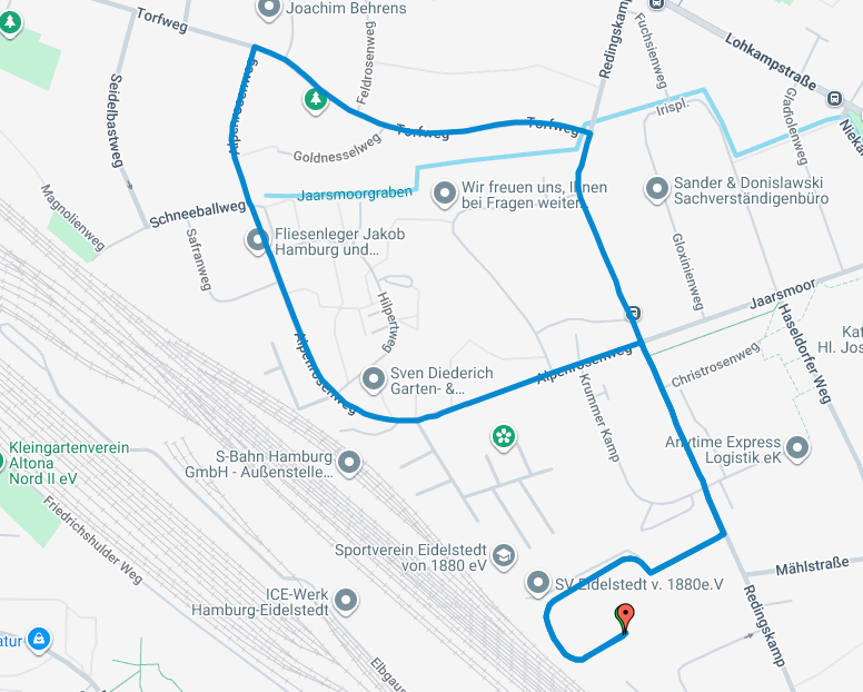 15km: Start Stadion Steinwiesenweg – Steinwiesenweg, Niendorfer Gehege, Kollauwanderweg, Amerkamp, Duvenacker, Beentkamp, Brookgraben (Gehege), Bondenwald, Niendorfer Gehege, Deelwisch, Baarkamp, Hagendeel, Hinter der Lieth, Beim Opferstein, Willinks Park, Beim Opferstein, Hagendeel, Hinter der Lieth, Amsinckpark, Stellinger Schweiz, Baarkamp, Oldenburger Straße, Vogt-Kölln-Straße, Pantherstieg, Nordfriesländer Straße, Jütländer Allee, Wördemanns Weg, Stellinger Deckel, Schöpbachweg, Olloweg, Sola-Bona-Park, Olloweg, Eidelstedter Feldmark, Eidelstedter Dorfstraße, Dörpsweg, Steinwiesenweg – Ziel Stadion Steinwiesenweg